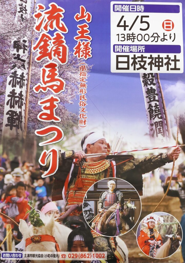 日枝神社流鏑馬祭 日時 令和8年4月5日(日曜日)午後1時 場所 日枝神社 土浦市小野沢辺東城寺 スケジュール 13:00 従羅天入場 13:05 将監入場 13:15 人身御供入場 13:25 主役揃い踏み 13:50 従羅天出陣 14:00 人見御供退場 14:15 神輿の渡御 14:40 将監出陣(流鏑馬開始) 15:10頃 流鏑馬終了